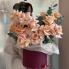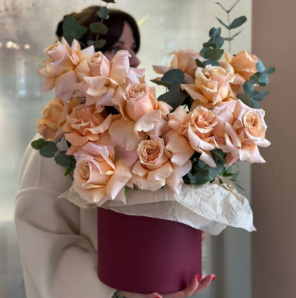 Шляпная коробочка французских (вывернутых) роз с добавлением эвкалипта