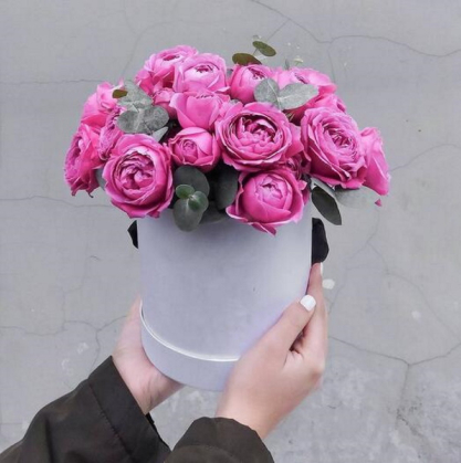 Коробка с эвкалиптом и пионовидными розами Мисти Баблс | Купить в Измайлово