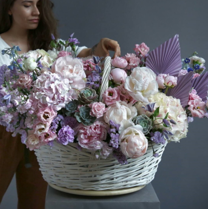Корзина из пионов, гвоздик, гортензий, твидии, эустомы и статицы, с добавлением суккулентов, клематисов и пальмы